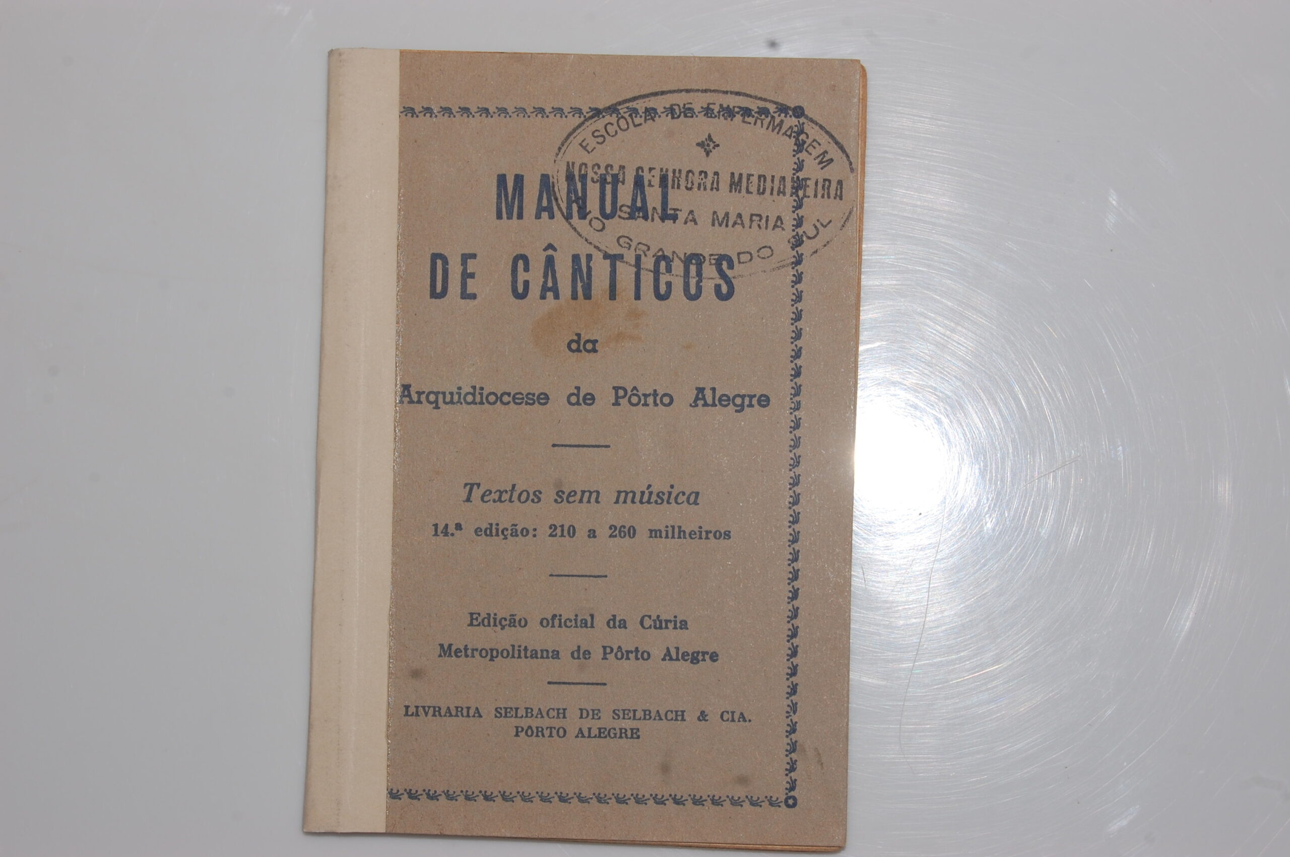 Manual de Cânticos Sacros Documento DSC_0656 Baixar MetadadosTítuloManual de Cânticos SacrosDescriçãoLivro na cor bege com a lombada refeita/restaurada na cor brancaTipo de MaterialPapelContexto HistóricoManual de Cânticos é um livro que reúne uma coleção de músicas e hinos usados nas celebrações litúrgicas da Igreja Católica.DimensõesAltura: 12,3 cm Largura: 8,5 cm Diâmetro: 15,5 cmAnexos