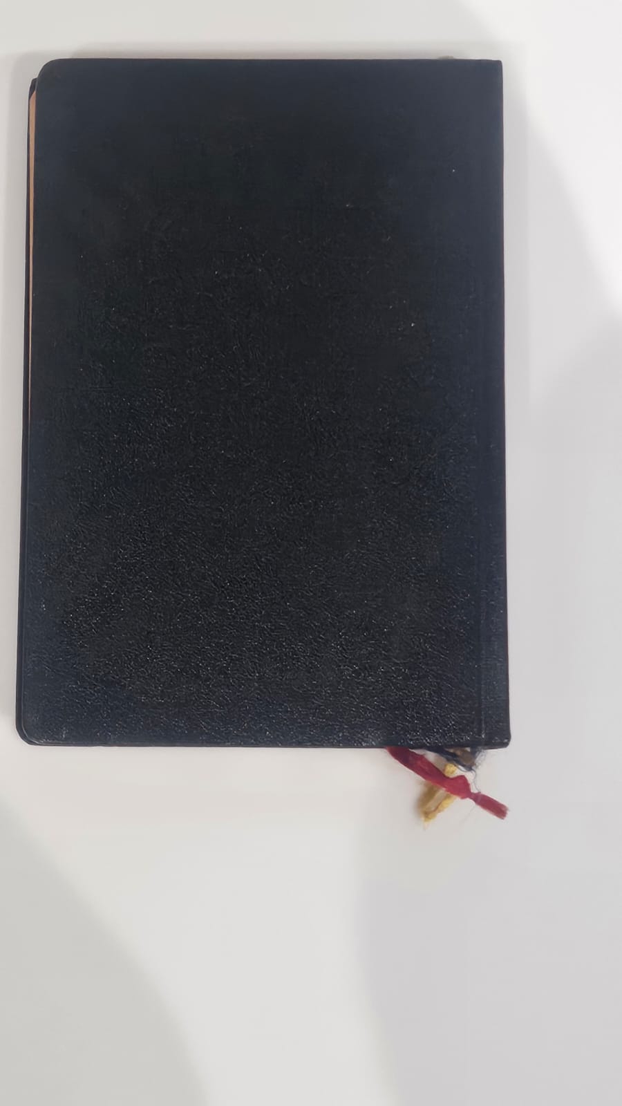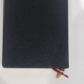 Livro na cor preta com desenhos e escritas em dourado. Possui marcador de texto em tecido.
